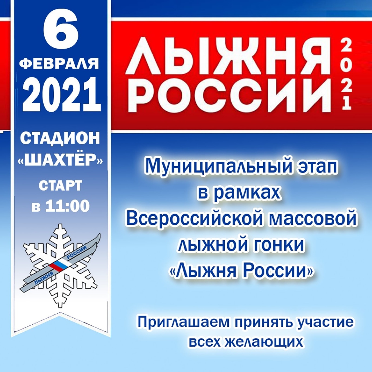 🎿Завтра, 6 февраля, в 11.00 на стадионе "Шахтёр" состоится лыжное состязание "Лыжня России-2021"