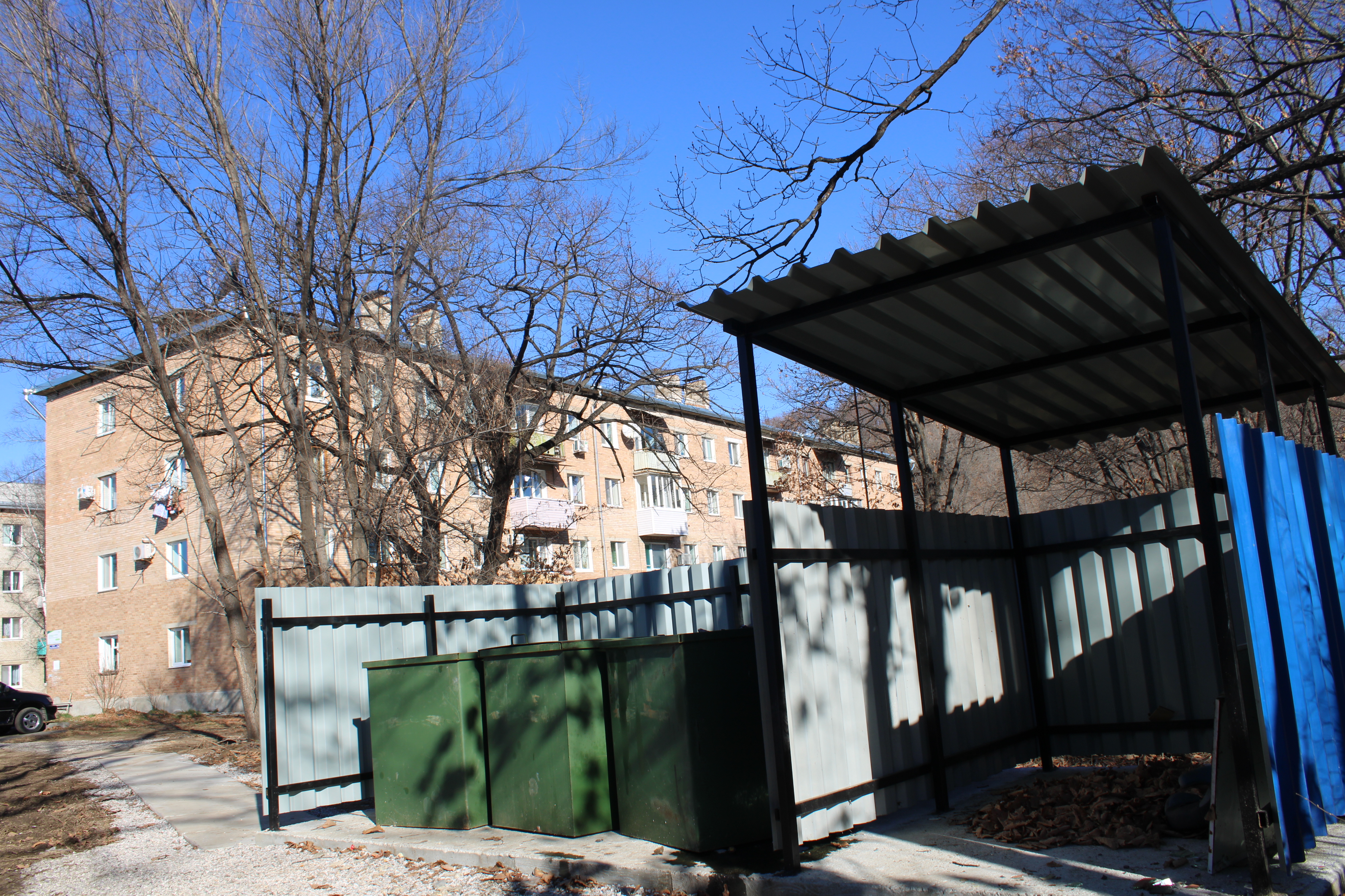 Обустроено четыре мусорных площадки с мусорными баками (по 3 на каждой площадки) и с крытыми коробами для сбора крупногабаритного мусора.