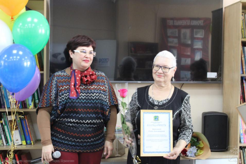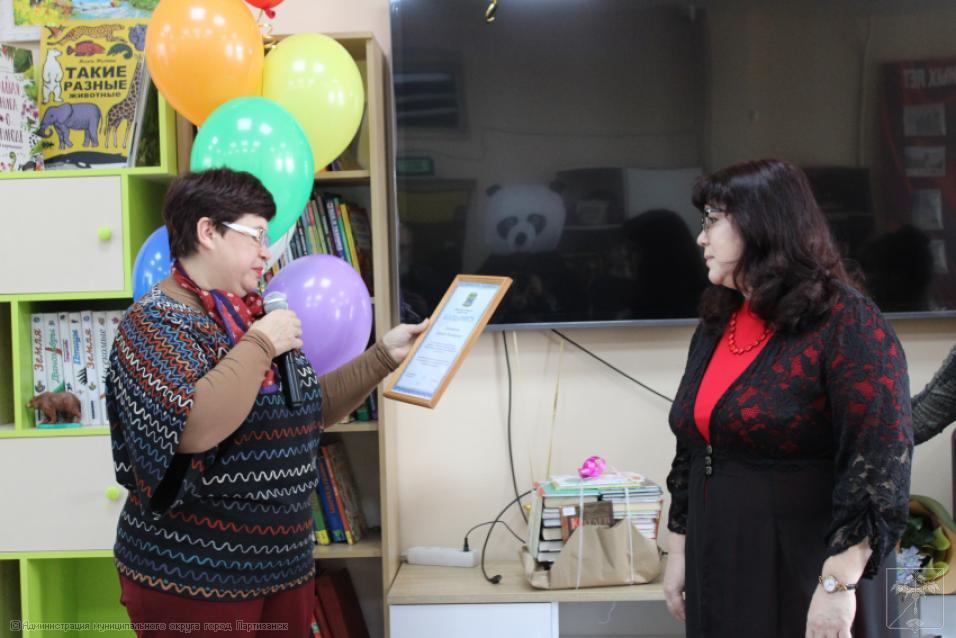 Оксана Гафарова вручила подарки руководителю библиотеки Елене Баженовой, а сотрудникам - благодарности от главы города.