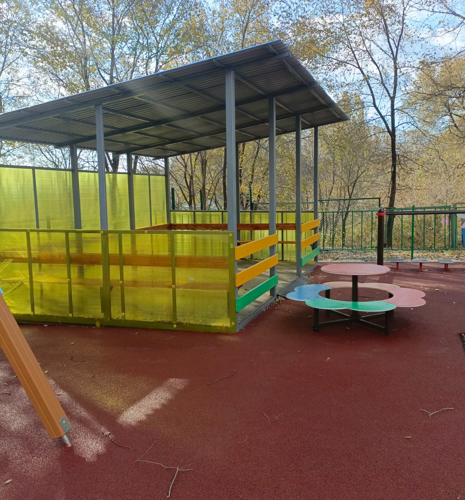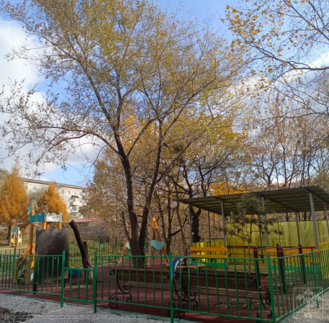 Здесь были установлены игровые и развивающие элементы, теневой навес, ограждение с калиткой, проведены работы по укладке безопасного покрытия.